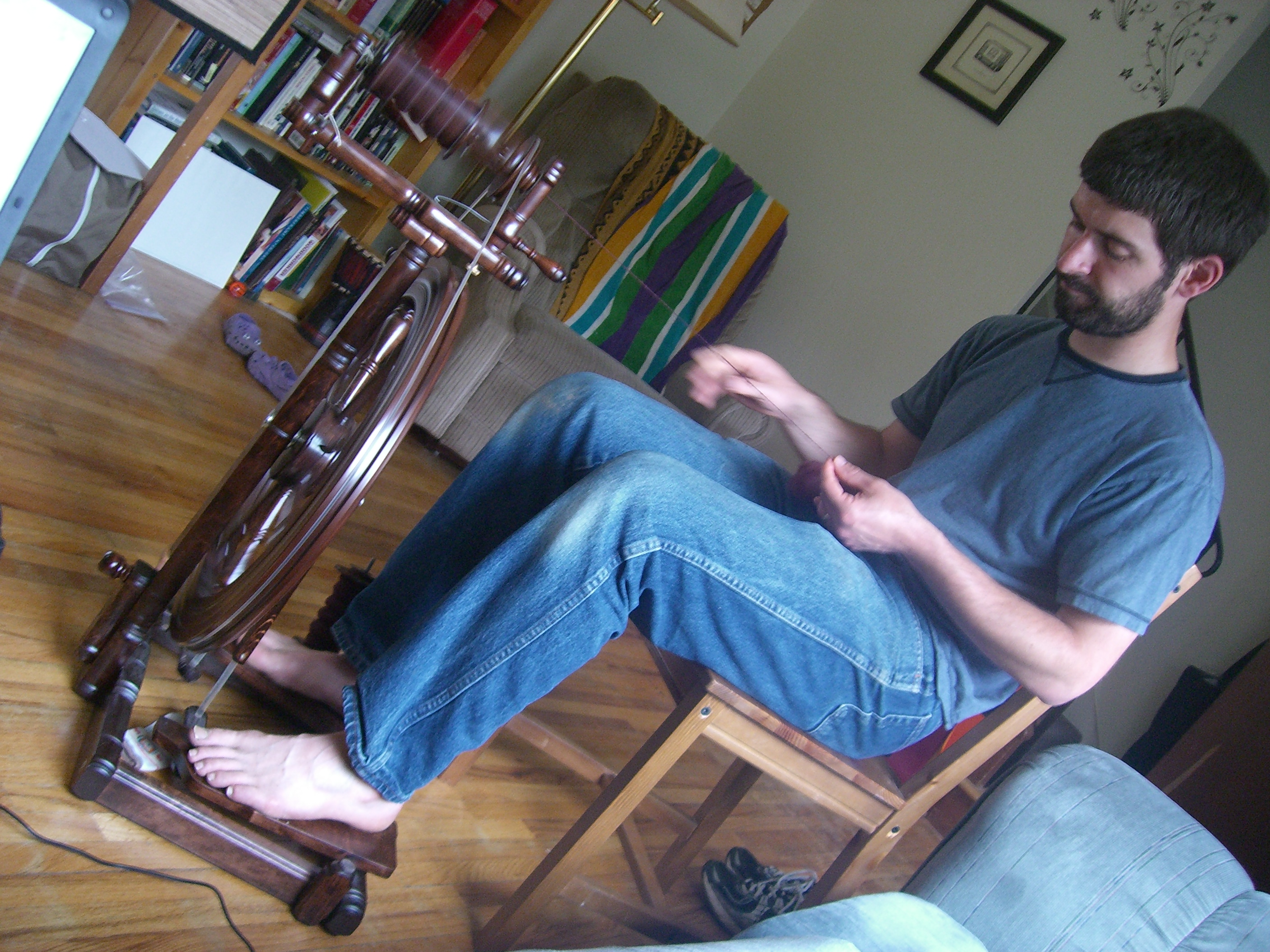 Another one of our major projects for the summer: starting a business. As you can see in the picture, Trevor spins wool into yarn, which we hope to start selling by the middle of the summer. The wool he is currently spinning is a chemically died maroon color that he is using as his practice/warm-up wool. He is on his second skein. In the future, he will be spinning mostly un-dyed or naturally dyed wool yarn.