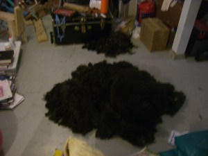 The wool we currently have (in various piles and bags about the house) comes from two sources. Some of it is from two Shetland rams and a llama-alpaca who inhabit a farm in Wisconsin. This wool comes to us unprocessed, and requires some attention before it can be spun. The picture below shows one of the five bags of wool we currently have from that farm, spread out on our basement floor: