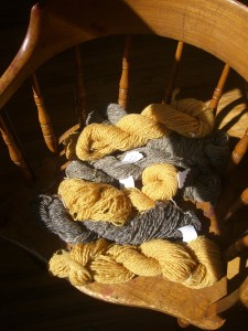 As you can see in the pictures above and below, we have a small pile of goldenrod and grey colored yarns, and some dusty rose is in process. Next we will need to wash these skeins in order to “set the spin”. Then they will be ready for sale! My job in the meantime is registering the business name and setting up an Etsy account, and all the other tiny details that go along with that. Trevor is responsible for deciding on a price and all the shipping details.