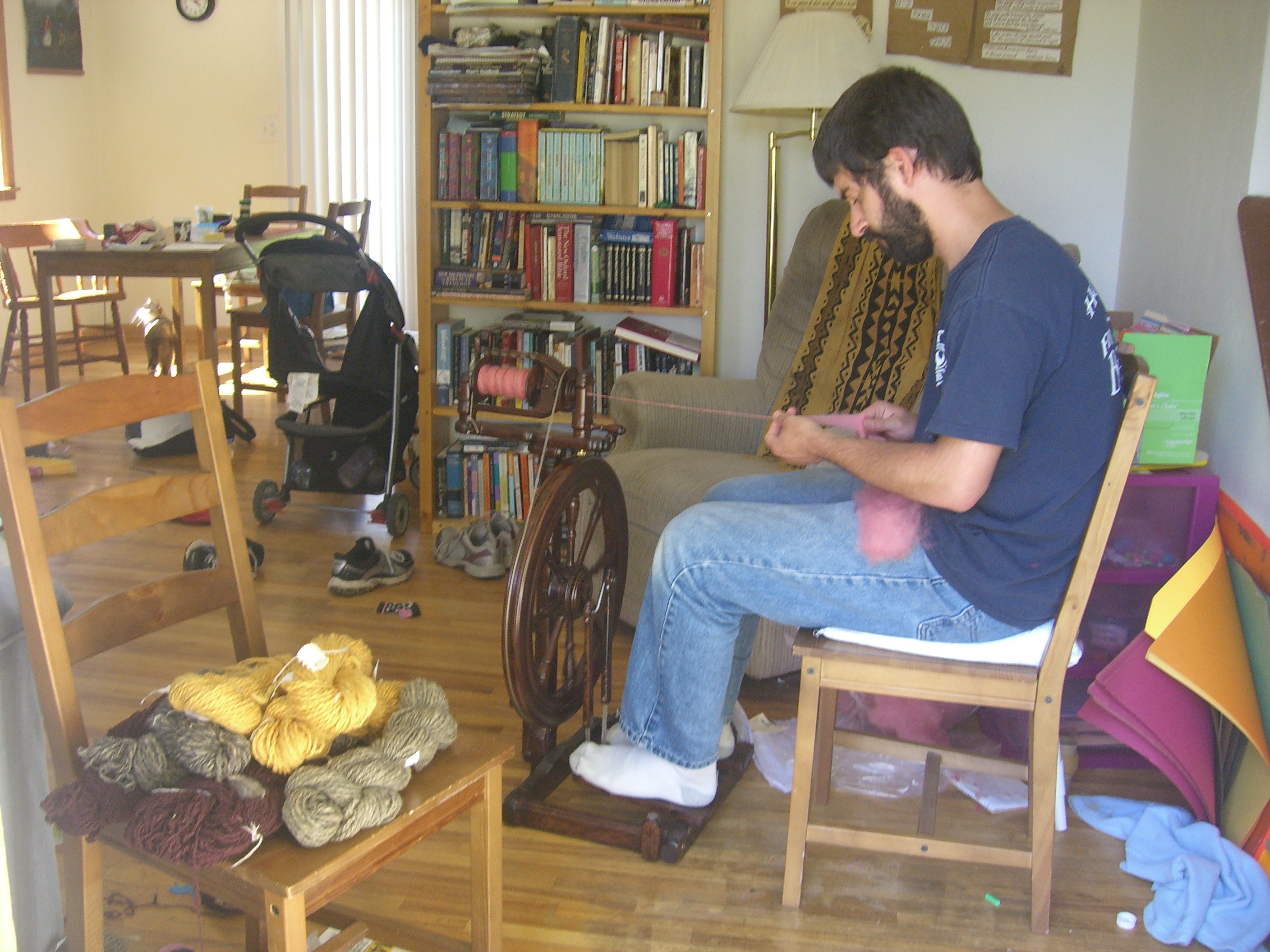 After much deliberation and helpful input from you good people, we have settled on a HommeSpun Yarns as Trevor’s business name. Since we’ve returned from Washington he’s been putting in more and more hours at the wheel, producing yarn at the rate of about three skeins every two days. As the weather has been ever so pleasant, he has positioned himself by the open front door, sometimes even taking the wheel onto the front steps to keep a better eye on Aubrey playing outside.