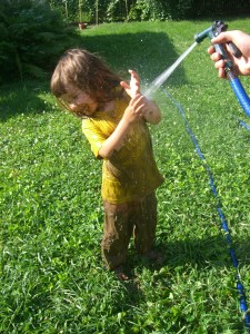Working in the garden has kept all three of us sane through the hot, drooping, middle days of summer. Aubrey has set aside a mud wallow for herself at one end, which is where she engages herself while we’re plucking out weeds. Below she is pictured getting hosed off after one such muddy adventure.
