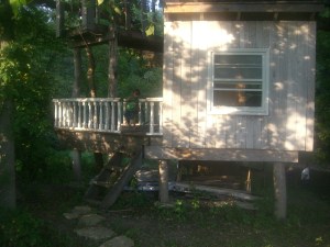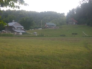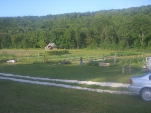 After eating, Aubrey and I took our exploration further across the hay field to the enormous, multi-leveled tree house with slide by the river. Trevor indulged his inquisitive nature by engaging the farm residents in conversation regarding the various aspects of the farm and upcoming classes and volunteer opportunities. At one point, as the sun was just setting, a motorized parachute flew low overhead, as its operators waved down to us. Every person on the farm looked up and waved together as if they were a single unit.
