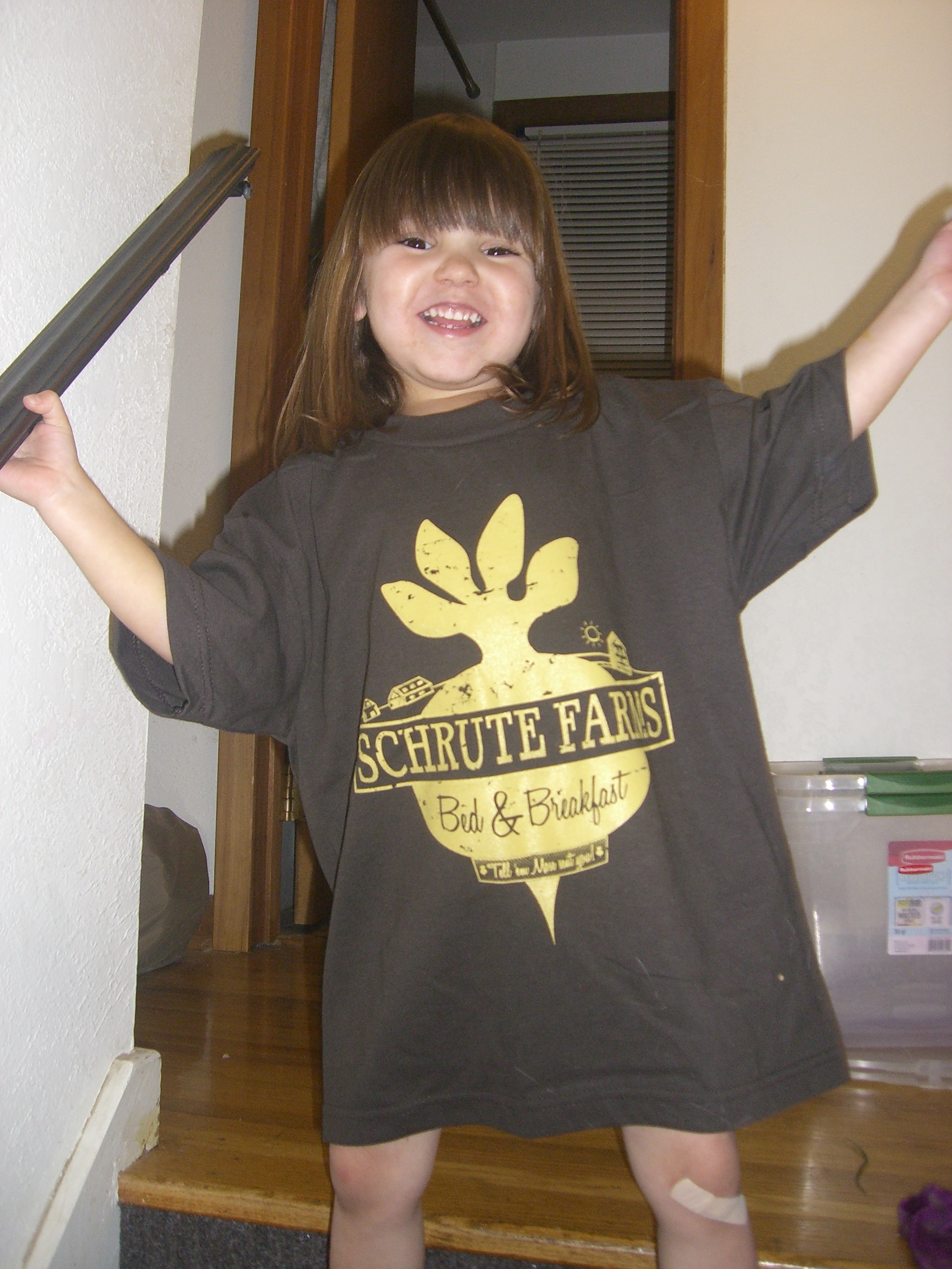 We are excited for the weekly art/music/food market that takes place in downtown Rochester every Thursday in the summer (http://www.downtownrochestermn.com/news-events/default.aspx). I hate to post without any pictures, so here’s one taken a few months back of Aubrey in a new farm-themed T-shirt. (The farm featured on the shirt is fictional, but it makes her happy to wear it anyways.)