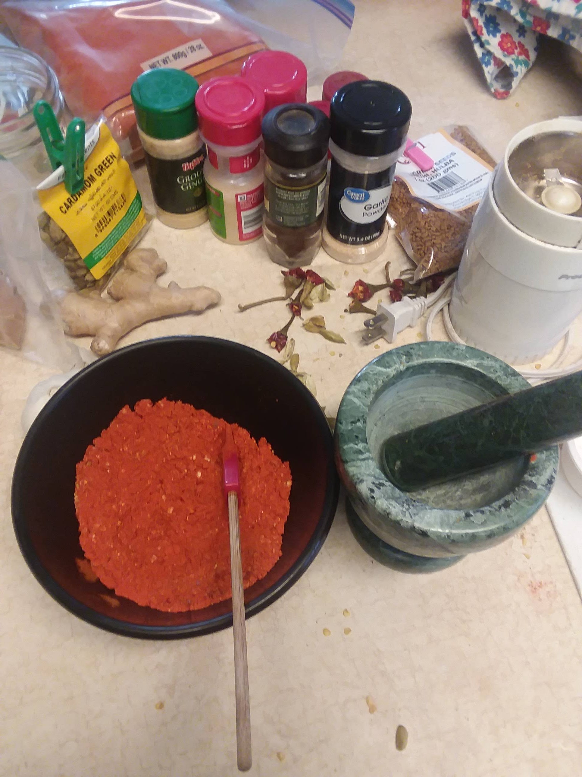 Indian grocery stores are a great source for a wide range of spices. The one I currently frequent is Desi Foods in Eagan, MN. I used a coffee grinder to grind up the fenugreek and cardamom for this spice mix, which worked great but left cracks in the plastic lid of the grinder. So I have since treated myself to a dedicated spice grinder that I look forward to using for future cooking projects.