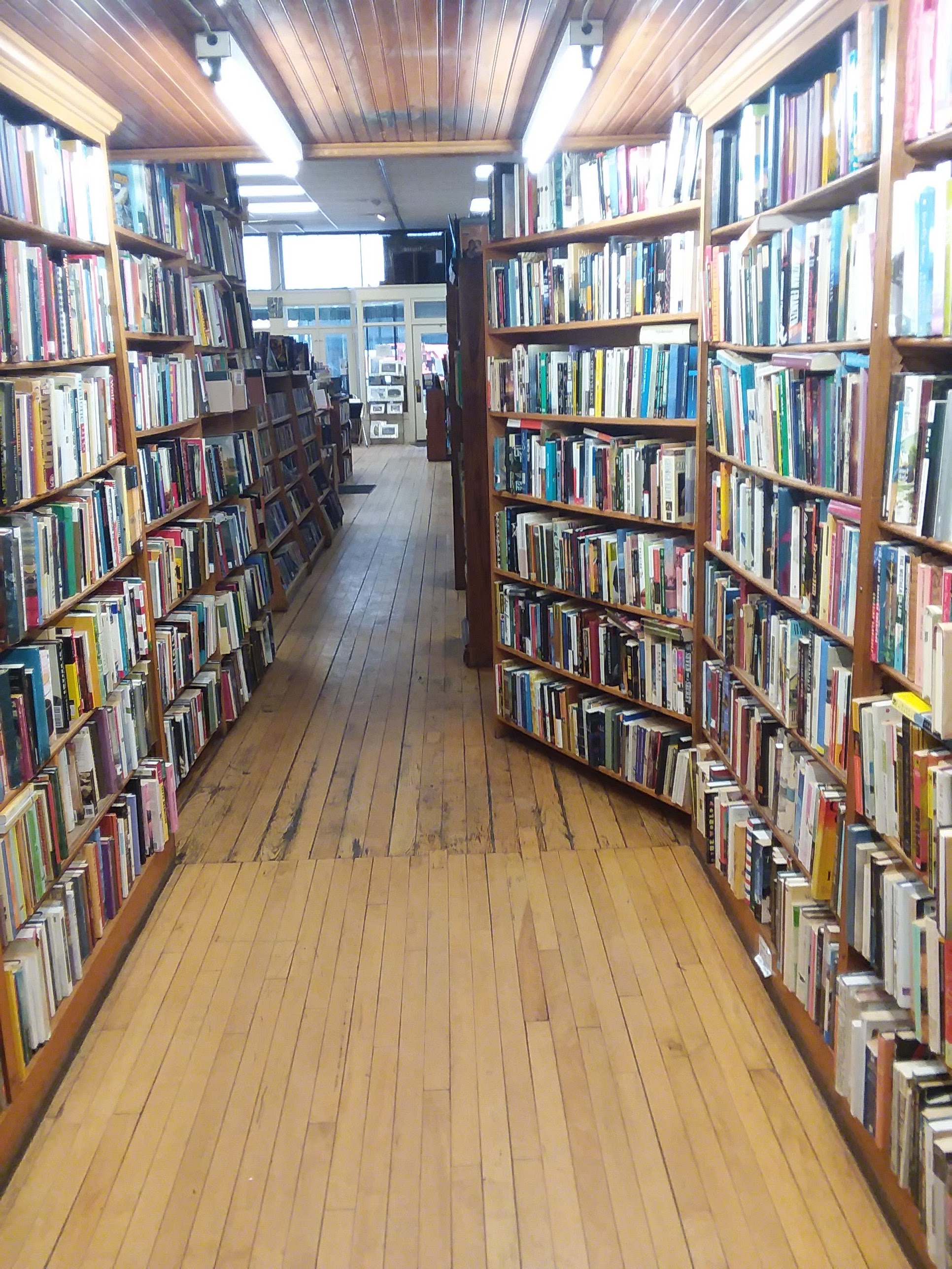 There is a little loft space that usually has comfortable sofas and chairs to sit in (when there’s not a pandemic on). There is a hearty selection of kids’ and teens’ books, too. My daughter got transfixed by the cover of a book about someone trapped in a twisted fairy tale (her current favorite sub-genre). When I told her the book was only ten dollars she gladly volunteered to buy it with her own money. I selected an advice book for memoir writers and a local priest’s self-published accounts of bike rides and canoe trips in southwest Wisconsin.