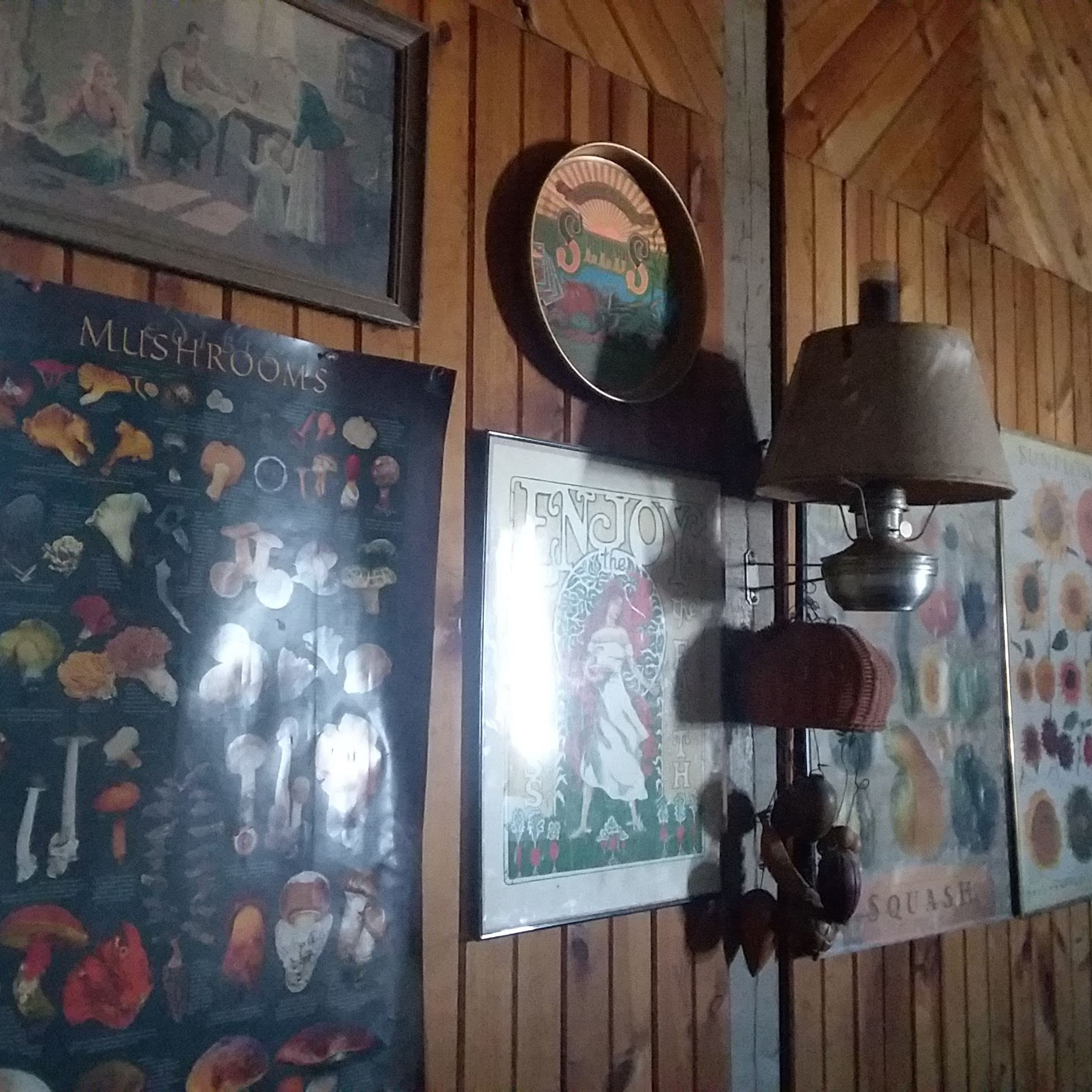 Behind the storefront is a cozy room with a woodburning cookstove surrounded by couches and bookshelves. The bookshelves are crammed with gardening manuals and vinyl records. Posters identifying varieties of mushrooms, squash, and sunflowers adorn the walls. Concertgoers pass through this room to get to the wide, worn staircase in the back of the building. The staircase ascends to the music venue on the second floor.