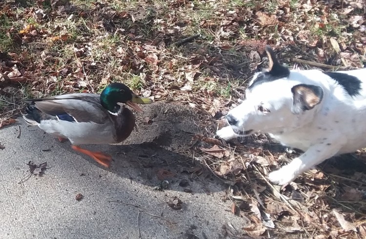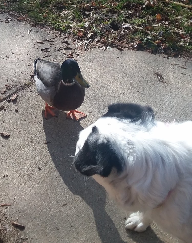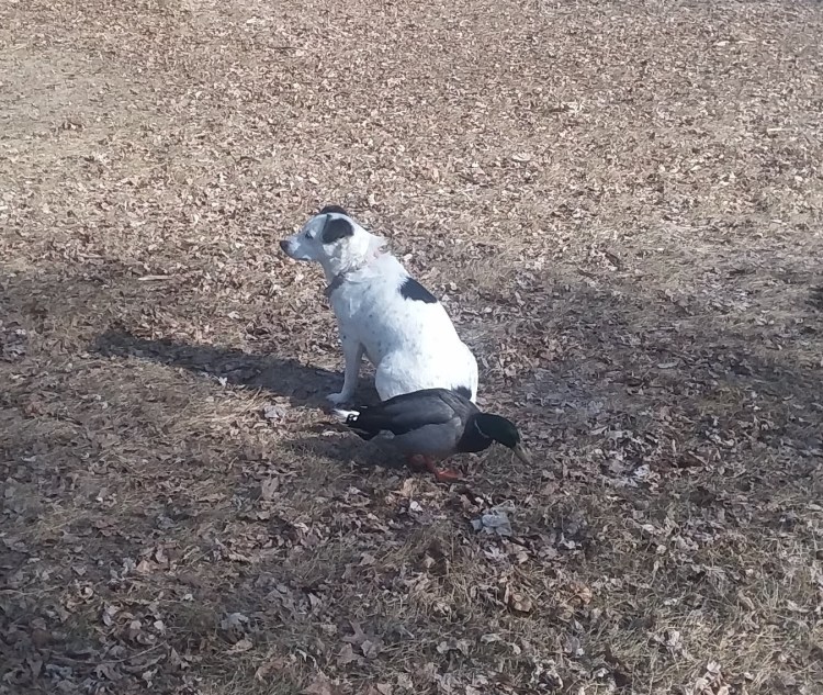 My very vocal mallard Peep has developed a particularly special relationship with Daphne. Lately Peep has been experiencing some rejection from his duck family. The larger mallard, Ping, has claimed both female Pekin ducks for himself. Especially when they are near water and desiring to mate, Ping will often chase Peep away. When this happens Peep goes looking for his dog-mother Daphne. If Daphne is sitting peacefully in the yard, Peep will come pecking at her tail or back, provoking her to play. Soon they will be chasing each other around the yard like two puppies.