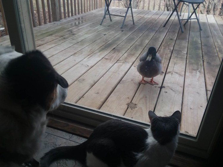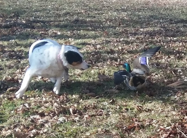 Who they’re really looking for is Daphne the dog. The ducks have been around Daphne since they were only two days old. When they were babies Daphne showed a maternal interest in them, begging to go into the garage several times a day to check on them. She still reminds me every morning when it’s time to go up to feed the birds and let them out. Anytime Daphne goes outside the ducks eventually find her and start following her around.