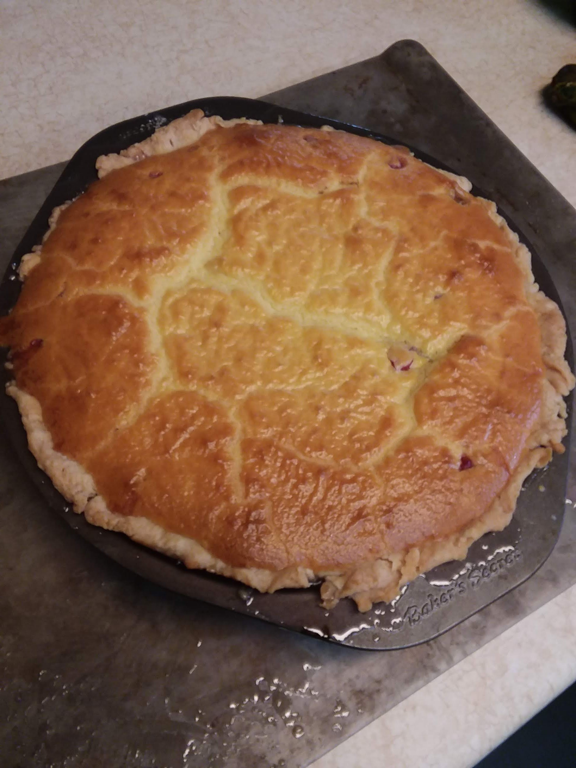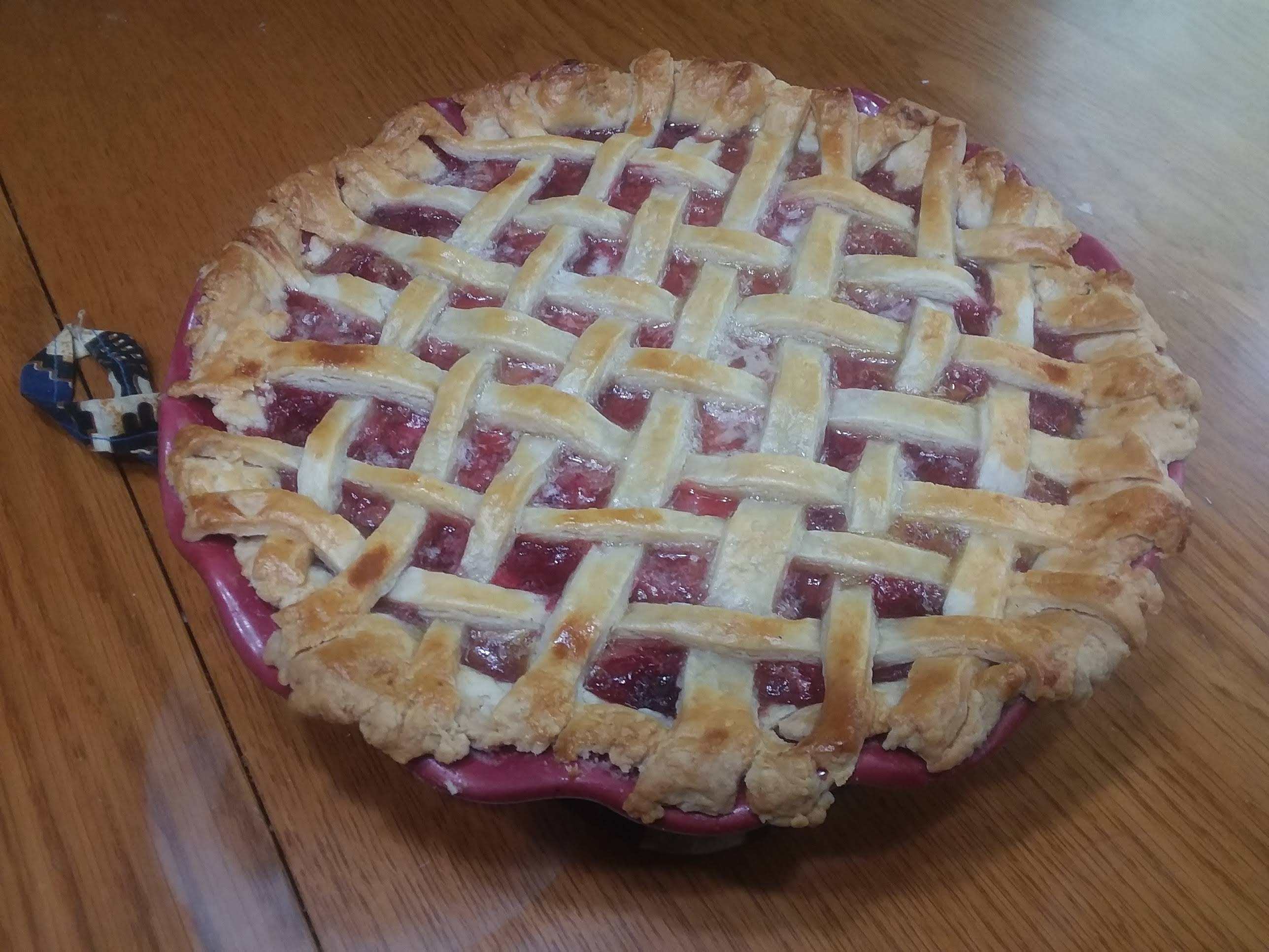 First, a strawberry rhubarb pie baked 10 days ago, so special it even had a lattice top crust.